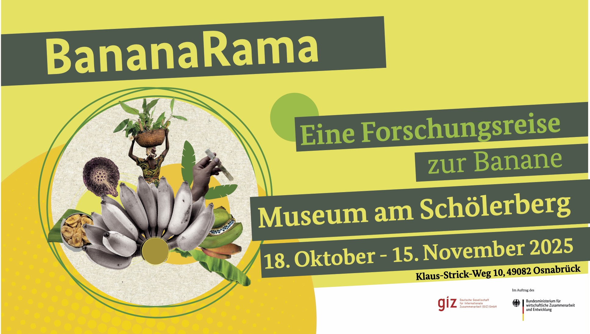 Das Museum am Schölerberg präsentiert vom 18. Oktober bis 15. November die Wanderausstellung „BananaRama – Eine Forschungsreise zur Banane“. Die interaktive Ausstellung zeigt, warum die Kochbanane für Millionen von Menschen unverzichtbar ist und welche Rolle die Agrarforschung für globale Ernährungssicherheit spielt.