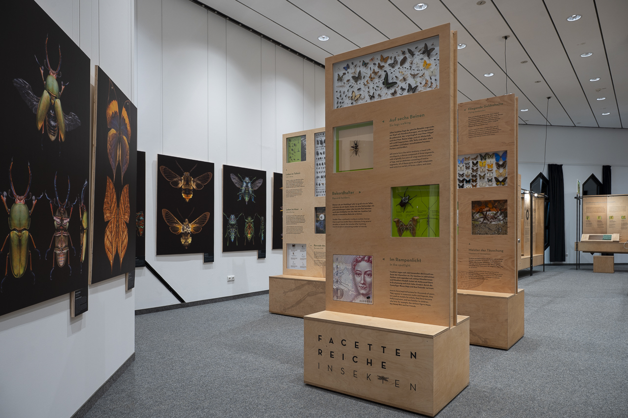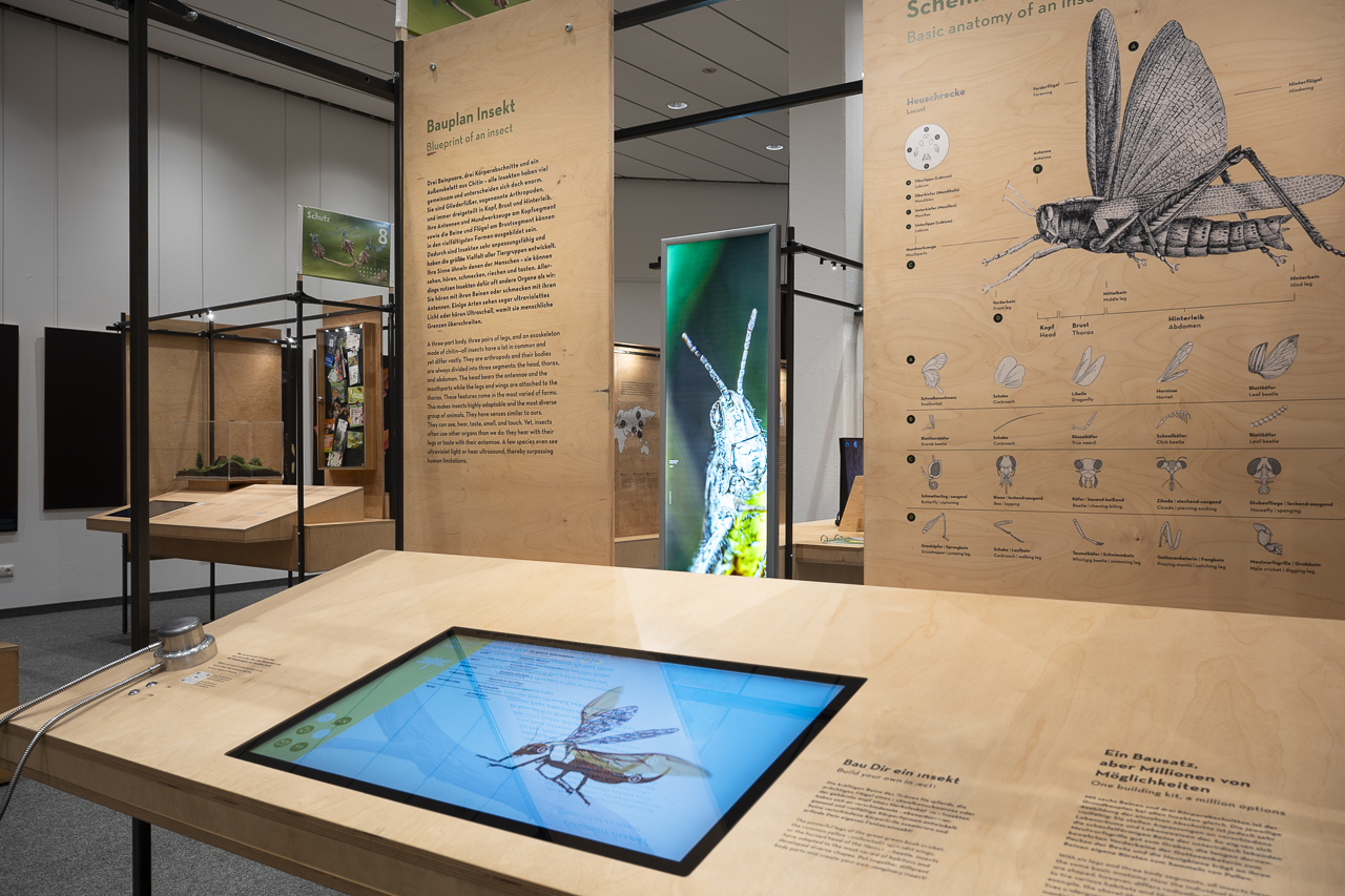 Die Ausstellung zeigt, wie raffiniert Insekten gebaut sind: vom Außenskelett über erstaunliche Sinnesleistungen bis hin zu Mundwerkzeugen, die je nach Art bohren, stechen, saugen oder knabbern können. Sie führt in Lebensräume, die von blühenden Wiesen über Gewässer bis hin zu Gletschern und Wüsten reichen und erklärt, mit welchen cleveren Strategien Insekten dort überleben, sich fortpflanzen oder Feinde täuschen.